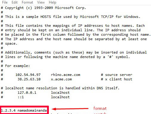 4.File hosts berisi baris teks yang terdiri dari alamat IP dalam text pertama diikuti oleh satu atau lebih hostname. Setiap field dipisahkan oleh spasi. Baris komentar bisa dimasukkan dengan cara menambahkan karakter hash (#) diposisi pertama baris tersebut. Berikut adalah contohnya: