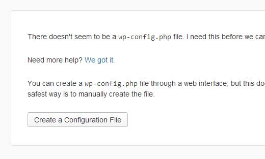 Klik pada tombol untuk membuat halaman konfigurasi. Halaman berikutnya akan menunjukkan informasi yang Anda butuhkan untuk memiliki (nama database, username database dan password, database host, dan table prefix). Anda masukkan sesuai dengan database yang sudah anda buat sebelumnya.