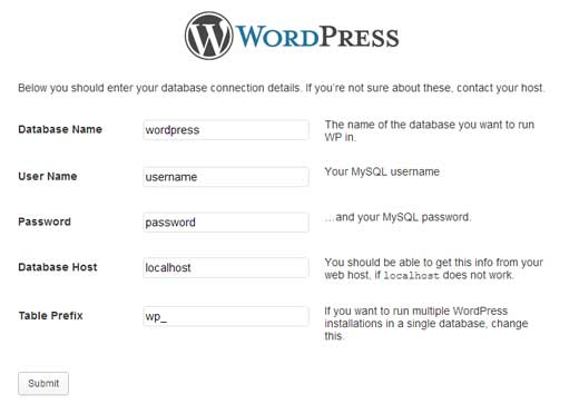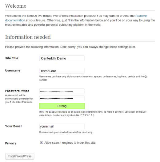 Pada layar berikutnya, Anda akan melihat form untuk memasukkan informasi website Anda. Informasi ini akan menjadi judul situs Anda, username, password, dan email.