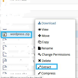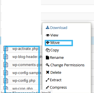 jika sudah di extract masih di folder wordpress anda harus memblok semua file wordpress dan klik kanan dan pindahkan ke /public_html/ untuk nama domain utama
