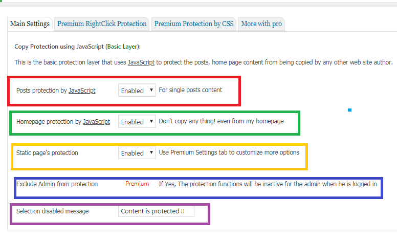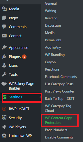 4.setelah aktif bisa melakukan setting di menu Dashboard > Settings > WP Content Copy Protection