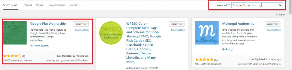 2.Ketikkan Google Plus Authorship di kolom Pencarian Plugin