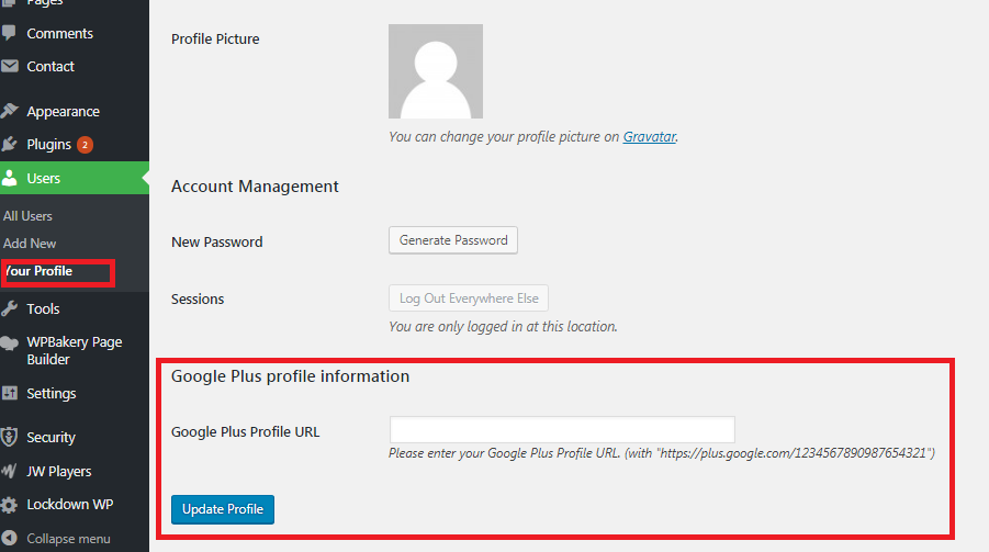 4..Setelah aktif itu lakukan pengaturan Setelah itu langsung saja masuk ke menu Users -> Your Profil dan input kode Google Plus di Google Plus profileinformation milik anda seperti gambar dibawah ini, dan selanjutnya lakukan update profile.