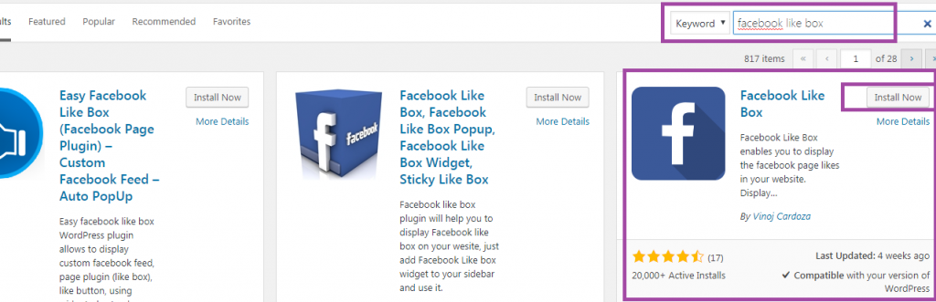 2. Pada kotak pencarian ketikkan nama plugin “Facebook like box”