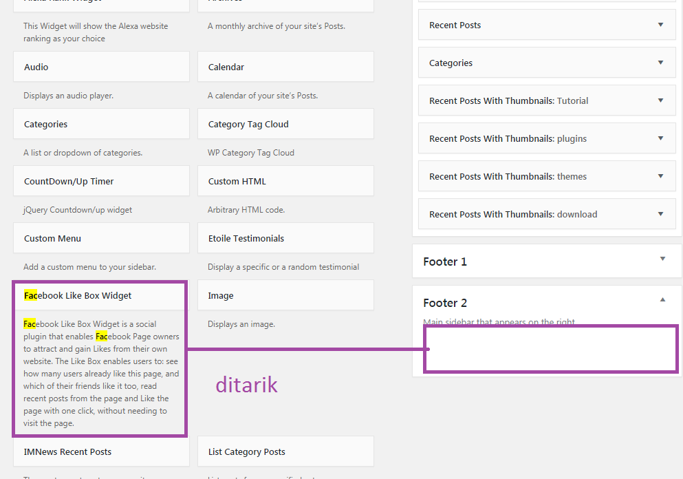 Untuk mengaktifkan widget “Facebook like box”,seperti gambar dibawah ini..