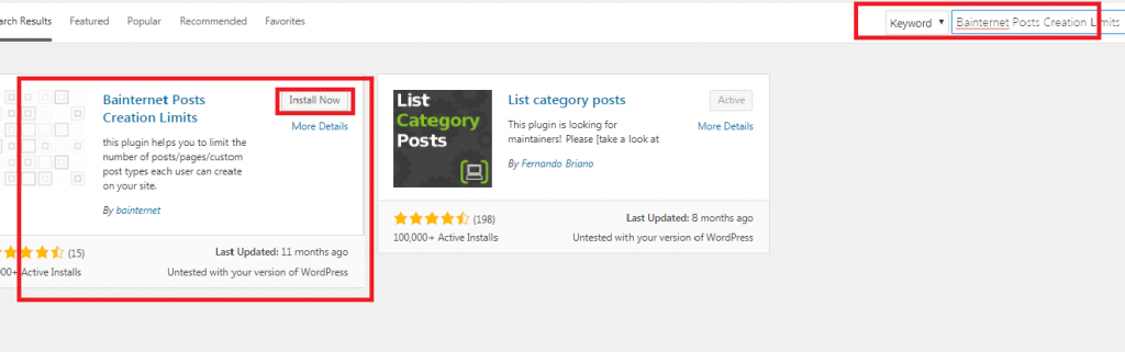 2.Ketikkan Bainternet Posts Creation Limits di kolom Pencarian Plugin