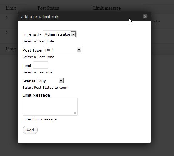Plugin ini dapat digunakan untuk membatasi jumlah posting yang dapat dibuat untuk tiap-tiap post type dengan menggunakan kriteria tertentu dan batasan waktu tertentu.