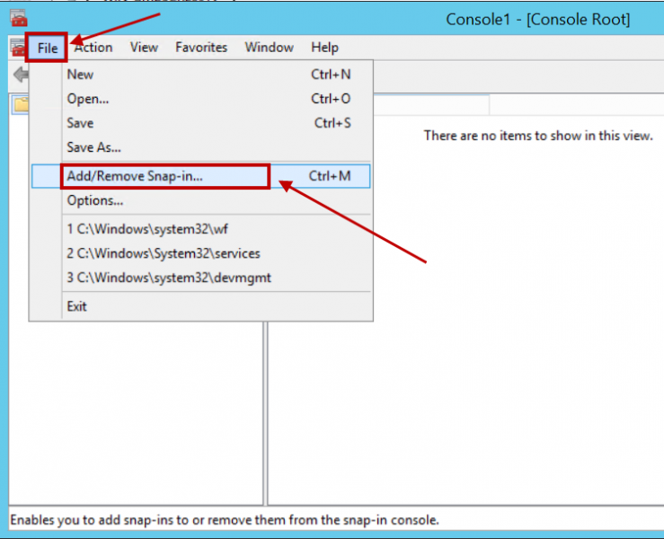 - Di MMC, klik File > Add/Remove Snap-in.