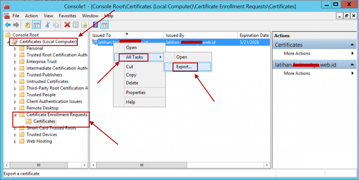 - Klik kanan pada sertifikat → pilih All Tasks > Export.