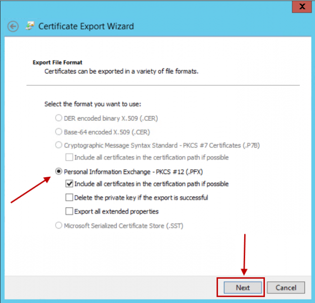 - Pilih Personal Information Exchange – PKCS #12 (.PFX).