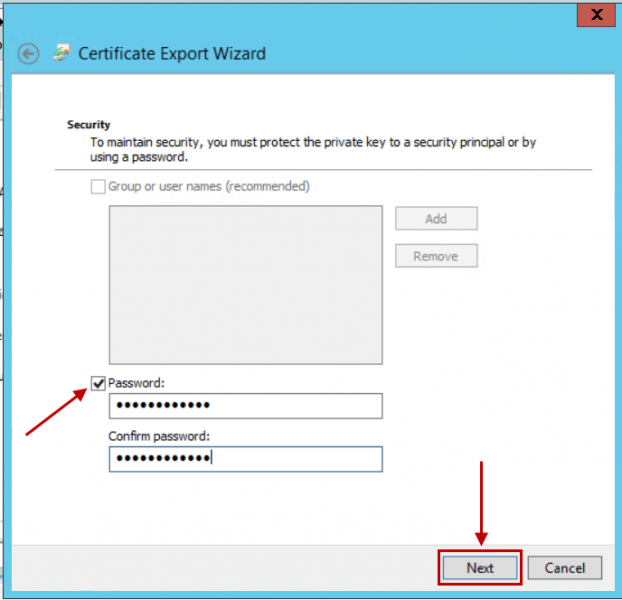 - Masukkan password untuk melindungi file .pfx (wajib).