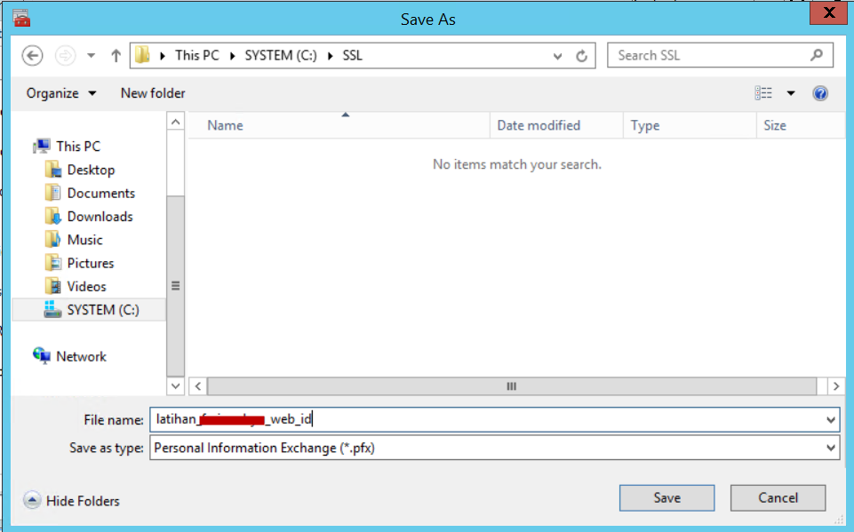 - Masukkan nama file dan lokasi penyimpanan (.pfx).