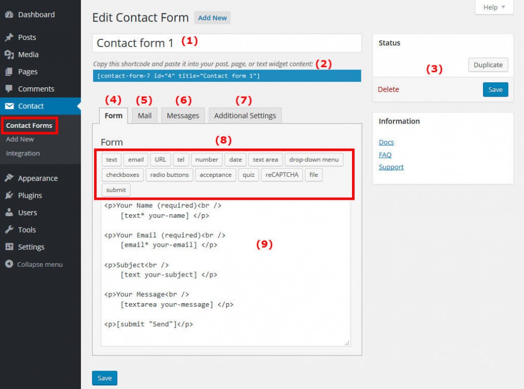 (1) Judul/Nama dari Contact Form. Buatlah judul sesuai dengan fungsi dari form yang Anda buat. Misalnya Anda membuat form untuk pendaftaran sebuah acara, maka Anda bisa beri judul Form Pendaftaran.