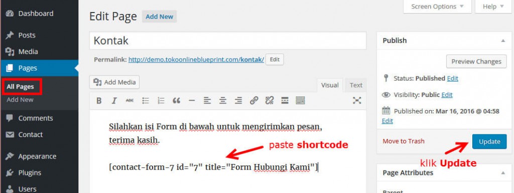Masuk ke halaman Kontak (silahkan buat halaman baru apabila halaman Kontak belum tersedia) kemudian Paste shortcode Form yang sudah Anda copy sebelumnya.