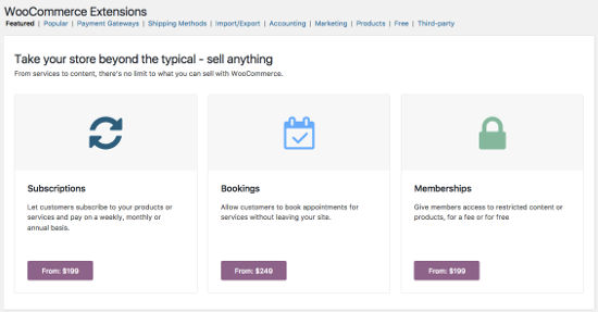 Bagian ini berisikan Extension atau plugin tambahan untuk WooCommerce. Dengan menambahkan plugin-plugin baru yang terdapat di bagian Extensions ini toko online WooCommerce Anda akan semakin kuat dengan fitur-fitur lebih. Di Extension para pengembang Plugin memungkinkan Anda untuk membeli ekstensi WooCommerce asli dan pihak ketiga dari toko Ekstensi mereka. Bahkan disitu Anda dapat membeli tema untuk toko online WooCommerce Anda.