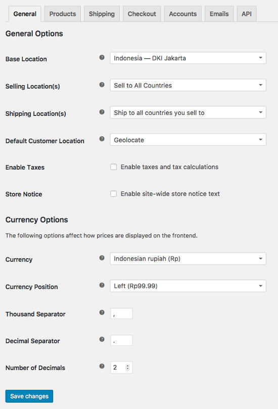 Tab “General” mengurus informasi dasar toko Anda, termasuk mata uang Anda, dasar & lokasi penjualan, dan opsi tampilan.
