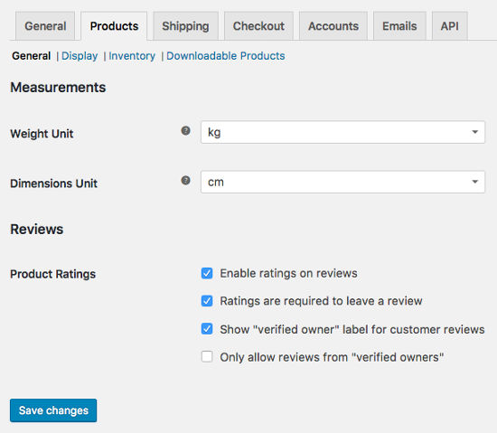 Tab “Product” terdapat pengaturan untuk penyortiran kustom, tampilan default, pengukuran, dimensi produk thumbnail, manajemen stock, metode download, dan bahkan Ajax / non-Ajax saat menambah tombol cart disesuaikan di tab Produk.