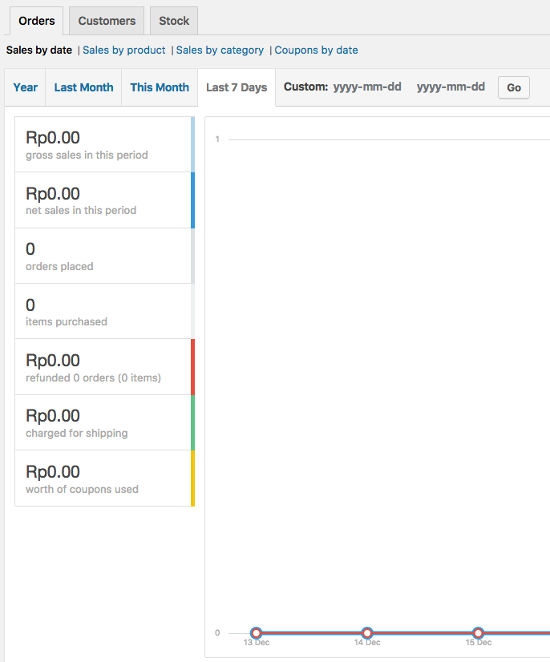 WooCommerce juga mempunyai sistem pelaporan yang canggih. Anda dapat melihat diagram dan grafik penjualan, order, dan biaya pengiriman yang bisa Anda tampilkan dengan lebih dari lima periode waktu yang berbeda. Setiap grafik dapat dibatasi untuk penjualan produk tertentu, kategori produk, atau kupon. Pada tab Pelanggan, Anda dapat melihat akuisisi pelanggan Anda selama lima periode waktu yang sama. Pada tab terakhir, Anda juga dapat melihat berapa stock atau persediaan produk Anda. Semua data laporan ini dapat diekspor dalam file CSV.