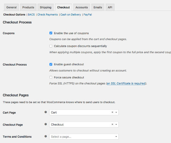 Tab “Checkout” Untuk mengatur dan menyesuaikan proses checkout: Anda dapat memilih lima sistem gateway pembayaran (pada bagian inilah Anda harus memasukkan rekening bank Anda), mengedit halaman, menambahkan halaman T & C, dan mengubah pelengkap URL.