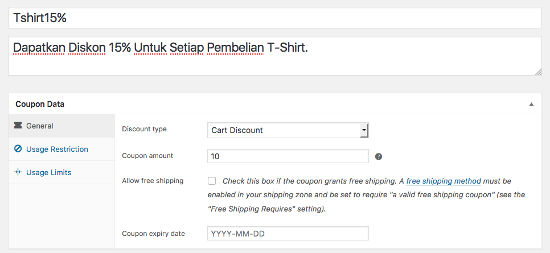 Pada menu Tab “General” memungkinkan Anda untuk mengedit informasi dasar kupon: jenis kupon (keranjang diskon, keranjang persentase diskon, diskon produk, dan produk persentase diskon), nilai, pilihan pengiriman gratis, kupon perpajakan, dan tanggal kedaluwarsanya kupon.