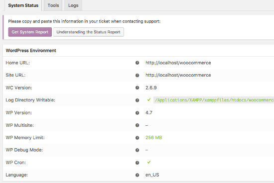 Menunjukkan semua informasi tentang situs Anda.Semua informasi belakang Anda – WooCommerce, server / PHP / MySQL / etc. versi, batas ukuran, dan banyak lagi – yang ditemukan di sini. Pada tab Tools pada halaman yang sama, Anda dapat menghapus cache website Anda untuk beberapa variabel, menginstal pilihan baru, dan reset pengaturan ke default.