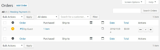 Halaman ini menampilkan daftar pembelian di toko online Anda saat ini dan pesanan. Jika Anda menjual produk digital, tidak ada banyak yang harus dilakukan di sini selain melihat produk apa yang dibeli. Tetapi jika Anda menjual dalam bentuk barang fisik, di sinilah Anda dapat mengatur produk apa yang Anda butuhkan untuk mengirim dan mengatur status pesanan sedang diproses (processing) atau ditunda (pending) dan masih banyak lagi.