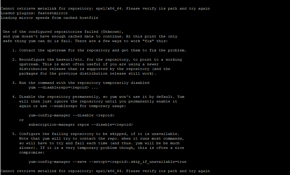 Jika Anda pengguna CentOS, mungkin pernah mengalami masalah saat mencoba menginstall paket menggunakan YUM. Salah satu error yang sering muncul adalah pesan yang menyatakan bahwa “One of the configured repositories failed (Unknown)”, disertai dengan keterangan bahwa “yum doesn’t have enough cached data to continue”. Masalah ini dapat terjadi karena beberapa alasan, seperti masalah pada repository yang dikonfigurasi atau kekurangan data cache atau dns cache resolver