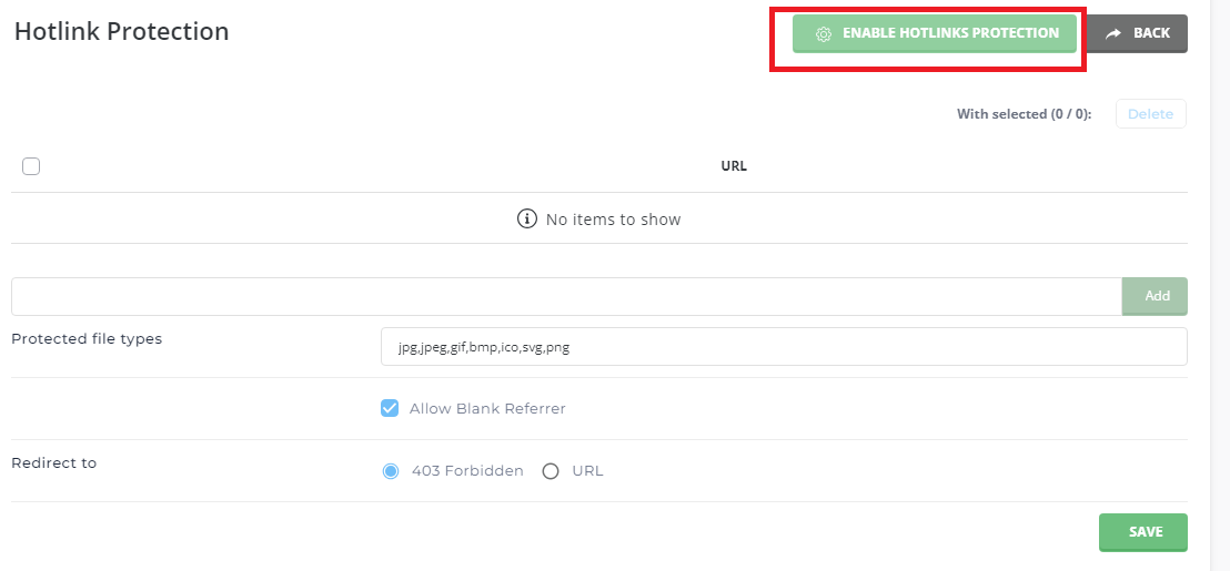 - Pada halaman Hotlink Protection, Anda akan melihat tombol “ENABLE HOTLINKS PROTECTION”. Klik tombol tersebut untuk mengaktifkan fitur ini.