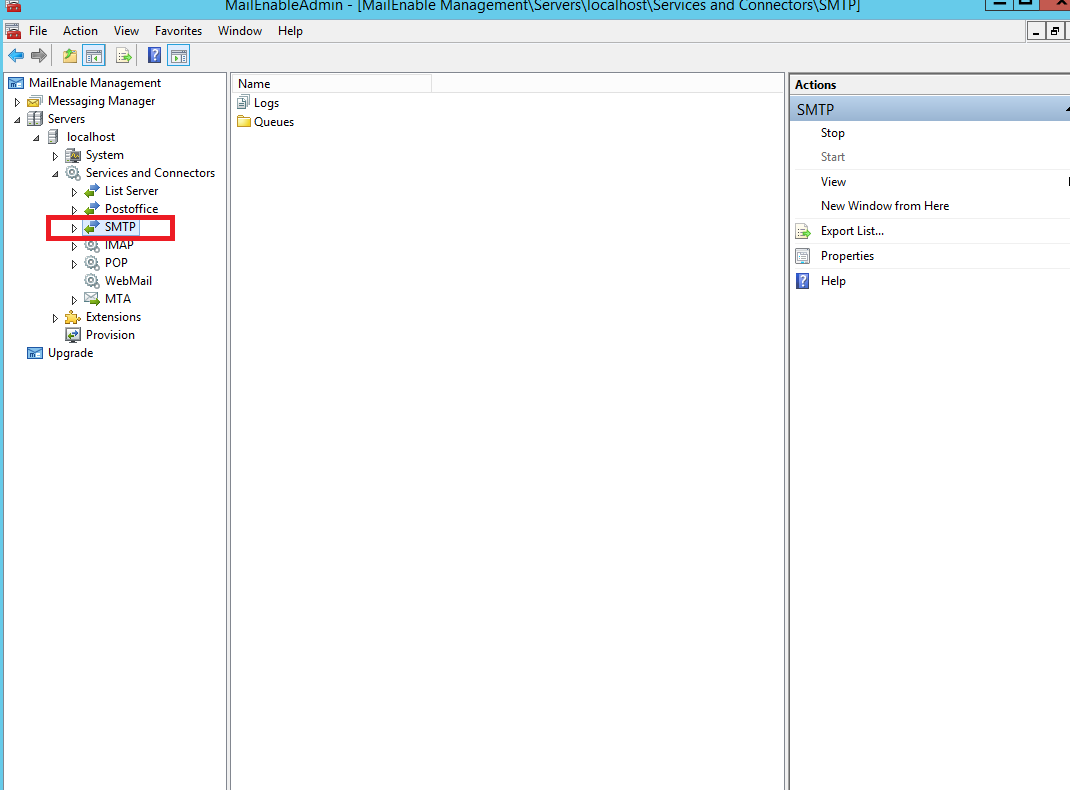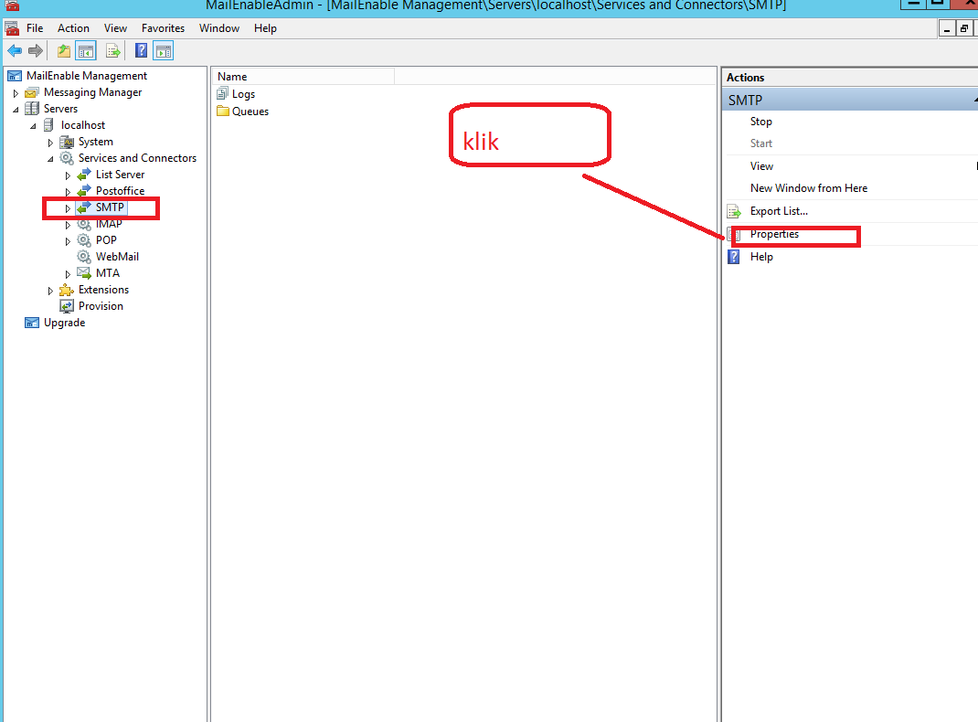3.setelah masuk Mail Enable Management pilih MailEnable Management > Servers > Localhost > Services and Connectors dan klik kanan SMTP dan buka Properties.