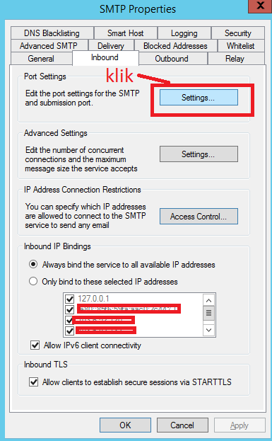 4.setelah masuk SMTP Properties window pilih tab Inbound lik click Settings (Port Settings).