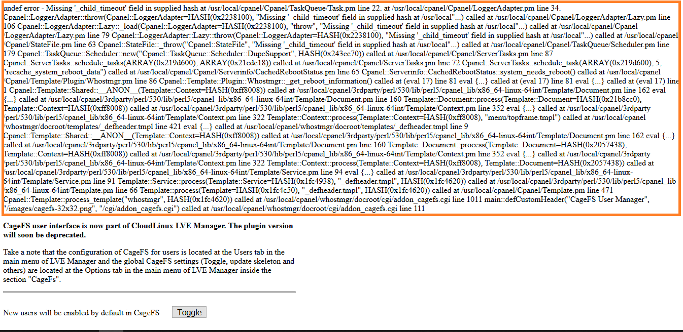 undef error - Missing 'child_timeout' field in supplied hash at /usr/local/cpanel/Cpanel/TaskQueue/Task.pm line 22. at /usr/local/cpanel/Cpanel/LoggerAdapter.pm line 34. Cpanel::LoggerAdapter::throw(Cpanel::LoggerAdapter=HASH(0x2238100), "Missing '_child_timeout' field in supplied hash at /usr/local"...) called at /usr/local/cpanel/Cpanel/LoggerAdapter/Lazy.pm line 106 Cpanel::LoggerAdapter::Lazy::_load(Cpanel::LoggerAdapter=HASH(0x2238100), "throw", "Missing '_child_timeout' field in supplied hash at /usr/local"...) called at /usr/local/cpanel/Cpanel/LoggerAdapter/Lazy.pm line 79 Cpanel::LoggerAdapter::Lazy::throw(Cpanel::LoggerAdapter=HASH(0x2238100), "Missing '_child_timeout' field in supplied hash at /usr/local"...) called at /usr/local/cpanel/Cpanel/StateFile.pm line 63 Cpanel::StateFile::_throw("Cpanel::StateFile", "Missing '_child_timeout' field in supplied hash at /usr/local"...) called at /usr/local/cpanel/Cpanel/TaskQueue/Scheduler.pm line 179 Cpanel::TaskQueue::Scheduler::new("Cpanel::TaskQueue::Scheduler::DupeSupport", HASH(0x243ec70)) called at /usr/local/cpanel/Cpanel/ServerTasks.pm line 87 Cpanel::ServerTasks::schedule_tasks(ARRAY(0x219d600), ARRAY(0x21cdc18)) called at /usr/local/cpanel/Cpanel/ServerTasks.pm line 72 Cpanel::ServerTasks::schedule_task(ARRAY(0x219d600), 5, "recache_system_reboot_data") called at /usr/local/cpanel/Cpanel/Serverinfo/CachedRebootStatus.pm line 65 Cpanel::Serverinfo::CachedRebootStatus::system_needs_reboot() called at /usr/local/cpanel/Cpanel/Template/Plugin/Whostmgr.pm line 86 Cpanel::Template::Plugin::Whostmgr::_get_reboot_information() called at (eval 17) line 81 eval {...} called at (eval 17) line 81 eval {...} called at (eval 17) line 1 Cpanel::Template::Shared::ANON(Template::Context=HASH(0xff8008)) called at /usr/local/cpanel/3rdparty/perl/530/lib/perl5/cpanel_lib/x86_64-linux-64int/Template/Document.pm line 162 eval {...} called at /usr/local/cpanel/3rdparty/perl/530/lib/perl5/cpanel_lib/x86_64-linux-64int/Template/Document.pm line 160 Template::Document::process(Template::Document=HASH(0x21b8cc0), Template::Context=HASH(0xff8008)) called at /usr/local/cpanel/3rdparty/perl/530/lib/perl5/cpanel_lib/x86_64-linux-64int/Template/Context.pm line 352 eval {...} called at /usr/local/cpanel/3rdparty/perl/530/lib/perl5/cpanel_lib/x86_64-linux-64int/Template/Context.pm line 322 Template::Context::process(Template::Context=HASH(0xff8008), "menu/topframe.tmpl") called at /usr/local/cpanel/whostmgr/docroot/templates/_defheader.tmpl line 421 eval {...} called at /usr/local/cpanel/whostmgr/docroot/templates/_defheader.tmpl line 9 Cpanel::Template::Shared::ANON_(Template::Context=HASH(0xff8008)) called at /usr/local/cpanel/3rdparty/perl/530/lib/perl5/cpanel_lib/x86_64-linux-64int/Template/Document.pm line 162 eval {...} called at /usr/local/cpanel/3rdparty/perl/530/lib/perl5/cpanel_lib/x86_64-linux-64int/Template/Document.pm line 160 Template::Document::process(Template::Document=HASH(0x2057438), Template::Context=HASH(0xff8008)) called at /usr/local/cpanel/3rdparty/perl/530/lib/perl5/cpanel_lib/x86_64-linux-64int/Template/Context.pm line 352 eval {...} called at /usr/local/cpanel/3rdparty/perl/530/lib/perl5/cpanel_lib/x86_64-linux-64int/Template/Context.pm line 322 Template::Context::process(Template::Context=HASH(0xff8008), Template::Document=HASH(0x2057438)) called at /usr/local/cpanel/3rdparty/perl/530/lib/perl5/cpanel_lib/x86_64-linux-64int/Template/Service.pm line 94 eval {...} called at /usr/local/cpanel/3rdparty/perl/530/lib/perl5/cpanel_lib/x86_64-linux-64int/Template/Service.pm line 91 Template::Service::process(Template::Service=HASH(0x1fc4938), "_defheader.tmpl", HASH(0x1fc4620)) called at /usr/local/cpanel/3rdparty/perl/530/lib/perl5/cpanel_lib/x86_64-linux-64int/Template.pm line 66 Template::process(Template=HASH(0x1fc4c50), "_defheader.tmpl", HASH(0x1fc4620)) called at /usr/local/cpanel/Cpanel/Template.pm line 471 Cpanel::Template::process_template("whostmgr", HASH(0x1fc4620)) called at /usr/local/cpanel/whostmgr/docroot/cgi/addon_cagefs.cgi line 1011 main::defCustomHeader("CageFS User Manager", "/images/cagefs-32x32.png", "/cgi/addon_cagefs
