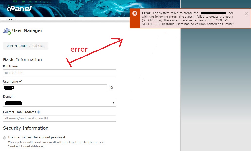 The system failed to update the “@domain” user with … hfjq5k) The system received an error from “SQLite”: SQLITE_ERROR