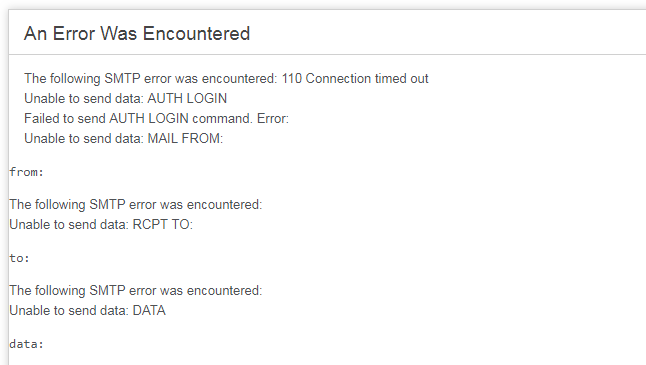 The following SMTP error was encountered: 110 Connection timed outUnable to send data: AUTH LOGINFailed to send AUTH LOGIN command. Error: Unable to send data: MAIL FROM:from: The following SMTP error was encountered: Unable to send data: RCPT TO:to: The following SMTP error was encountered: Unable to send data: DATA