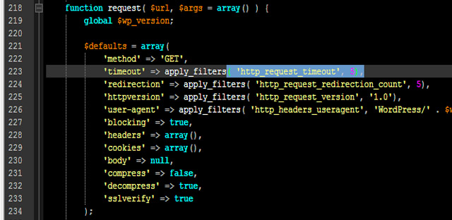 ‘timeout’ => apply_filters( ‘http_request_timeout’, 5),