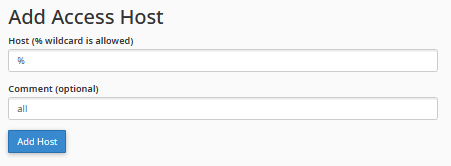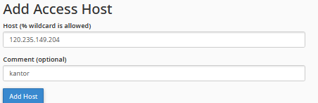 - Klik tombol Add Host untuk menambahkan alamat IP tersebut ke daftar yang diperbolehkan.Setelah alamat IP ditambahkan, cPanel akan memberikan akses dari IP tersebut ke database MySQL Anda.