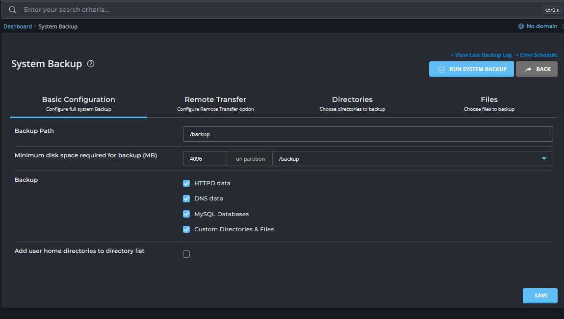 - Add User Home Directories to Directory List secara otomatis menambahkan direktori home setiap pengguna ke daftar backup. Opsi ini sangat bermanfaat jika server Anda mengelola banyak akun pengguna, dan Anda ingin memastikan data mereka terbackup dengan baik.