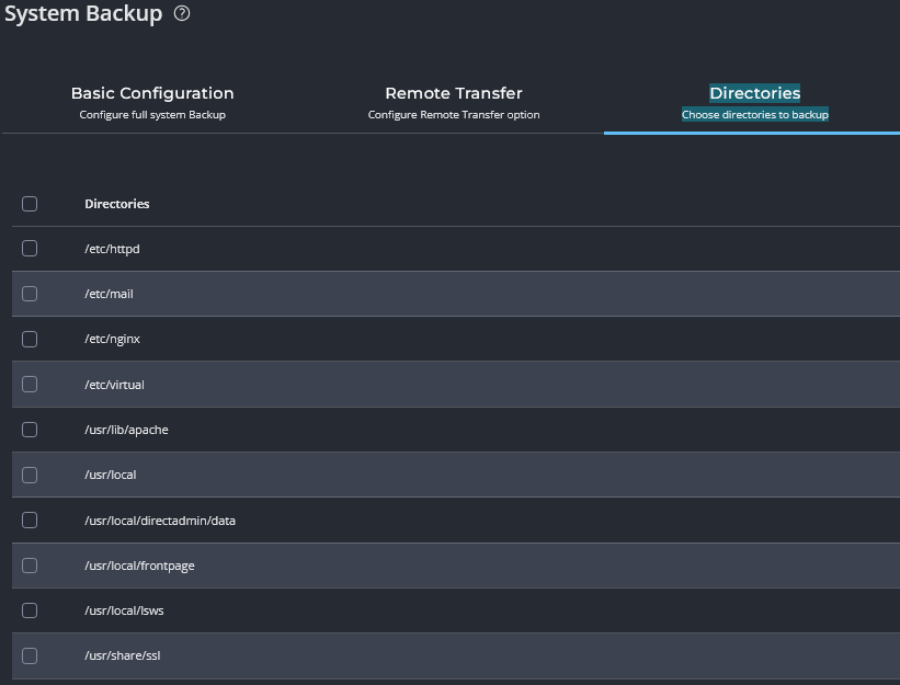 - System Files: Backup file sistem seperti konfigurasi server, file konfigurasi DirectAdmin, dan lainnya.