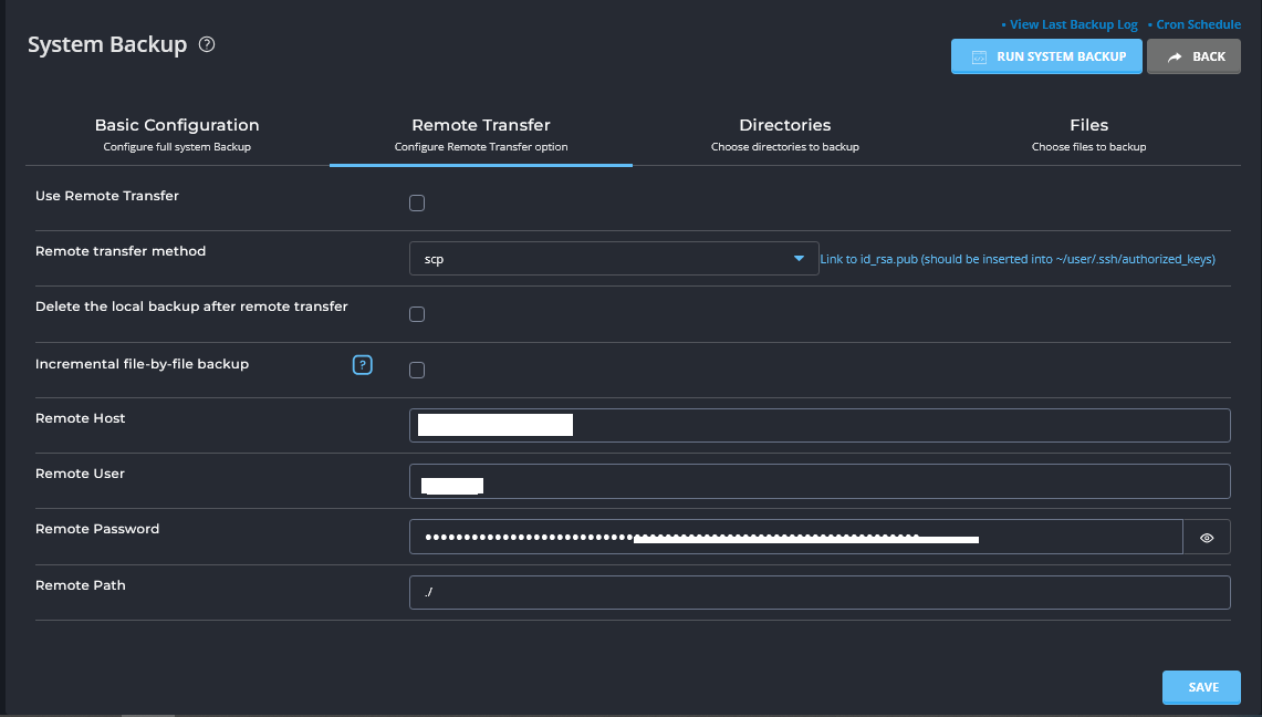 Di bagian Remote Transfer, Anda akan mengonfigurasi opsi untuk mentransfer backup ke server remote. Berikut adalah opsi yang dapat Anda atur: