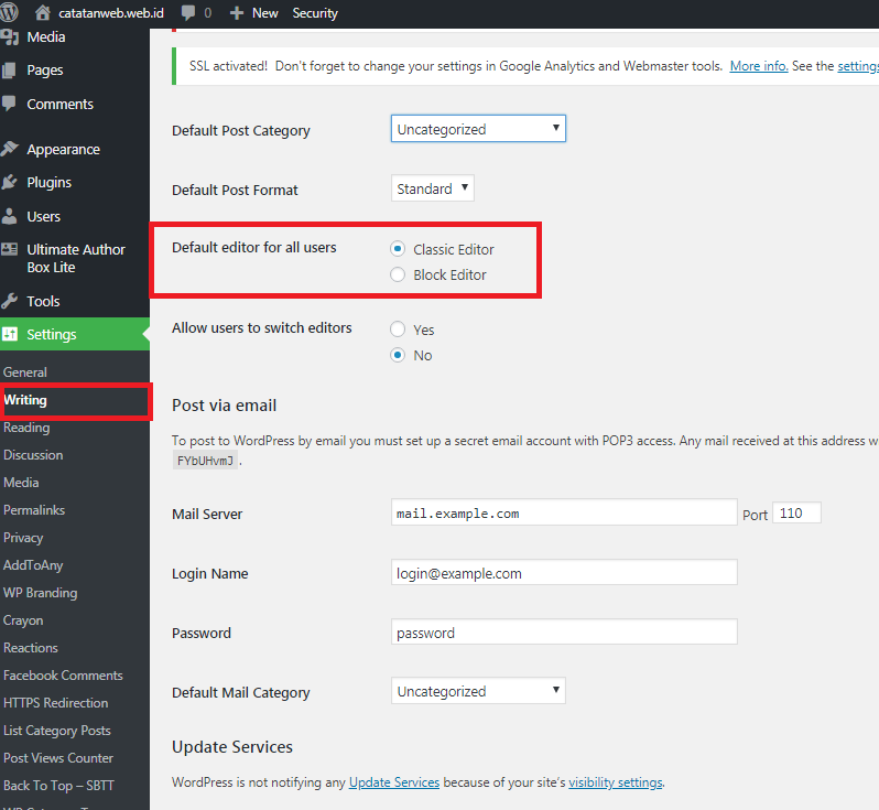 4.setelah aktif bisa melakukan setting di menu Dashboard > Settings > Writing >pilih classic editor