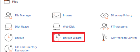 - Setelah berhasil login ke cPanel, cari dan klik opsi Backup Wizard di bagian Files pada halaman utama cPanel.