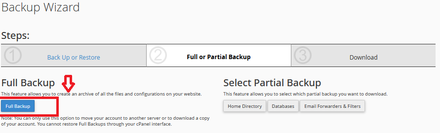 - Pilih Full Backup jika Anda ingin mencadangkan semua data dan file pada akun hosting Anda.