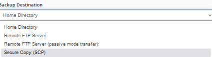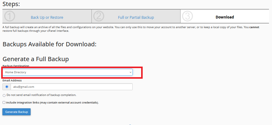 - Backup Destination: Pilih tempat penyimpanan backup. Biasanya, pilihan ini diatur ke Home Directory, yang berarti file backup akan disimpan dalam direktori utama di server hosting Anda.