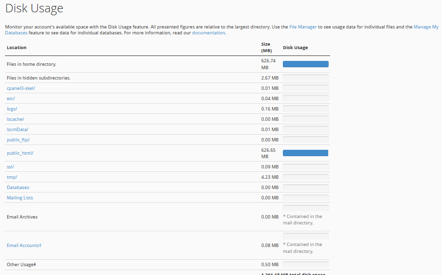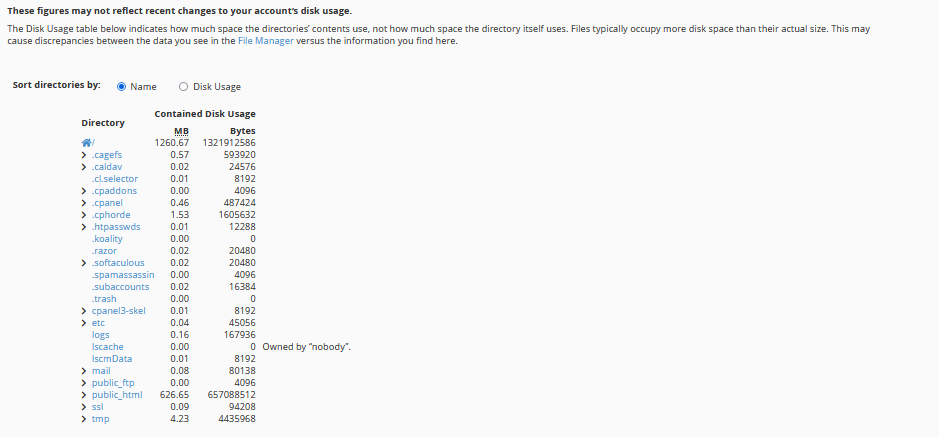 - Untuk mencegah ruang penyimpanan Anda terisi penuh, sebaiknya periksa Disk Usage secara berkala. Jika Anda mendeteksi folder atau file besar yang tidak lagi relevan, segera hapus atau pindahkan file tersebut untuk memastikan situs web Anda tetap berjalan dengan lancar.