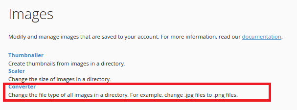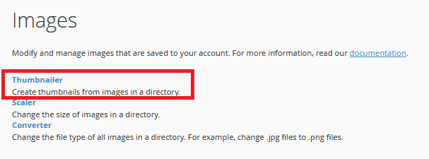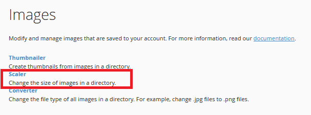 - Setelah login, cari dan klik Images di bagian Files pada dashboard cPanel. Di sini Anda akan menemukan beberapa fitur terkait gambar seperti Thumbnailer, Scaler, dan Converter.