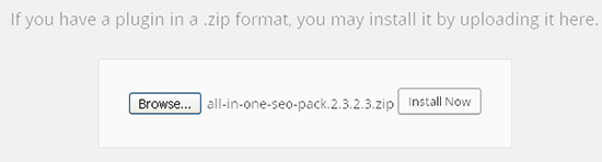 Ini akan membawa Anda ke halaman Plugin upload. Di sini Anda perlu untuk mengklik tombol Browse dan pilih file plugin yang sudah Anda download ke komputer Anda.