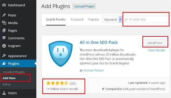 Anda akan melihat halaman seperti pada gambar di atas. Cari plugin dengan mengetikkan nama plugin atau fungsi yang ingin Anda cari, seperti pada contoh diatas saya akan menginstall plugin All in One SEO, maka dalam kolom pencarian saya ketikkan All in one SEO. Setelah itu, Anda akan melihat sekelompok listing seperti contoh di bawah: