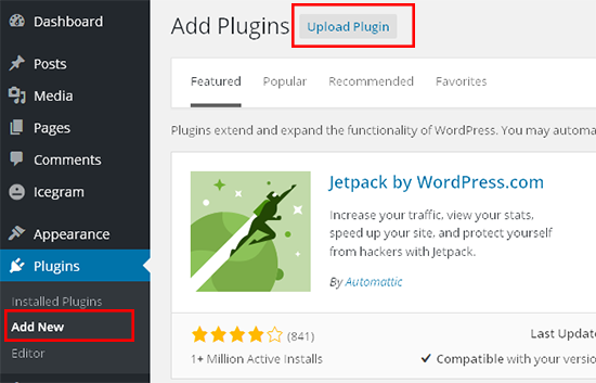 Pertama, Anda perlu men-download plugin dari sumber (file tersebut dalam format zip). Selanjutnya, Anda silahkan masuk ke WordPress admin area dan masuk ke menu Plugins »Add New.