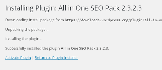 WordPress sekarang akan men-download dan menginstal plugin di situs Anda. Silahkan tunggu beberapa saat sampai Anda melihat melihat pesan sukses dengan link untuk mengaktifkan plugin atau kembali ke Plugin installer.