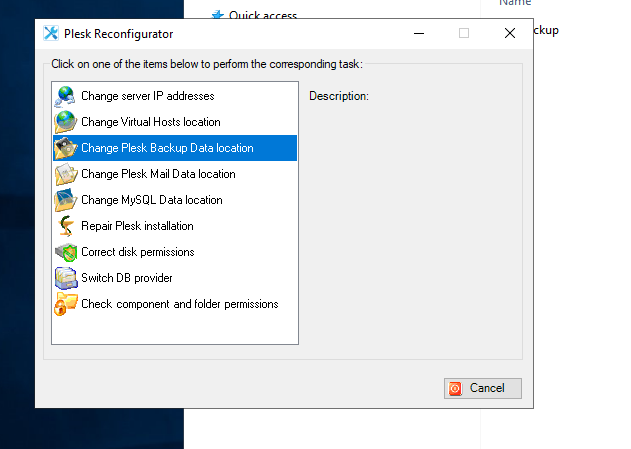 - dan masul Plesk Reconfigurator, pilih Change Plesk Backup Data location.