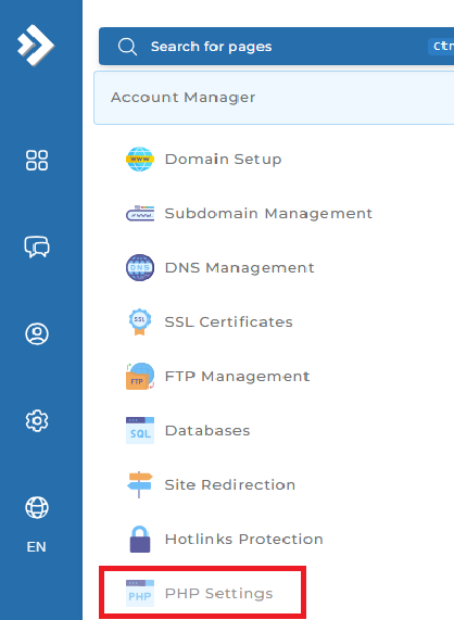 - Klik opsi “PHP Settings”. Jika Anda tidak melihatnya langsung, kemungkinan Anda akan menemukannya di dalam bagian Advanced Features atau Web Options.